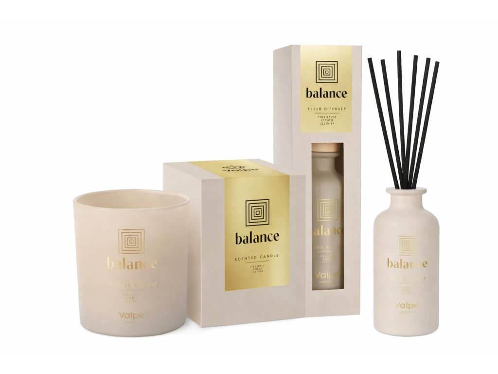 Objav dokonalú rovnováhu vôní a dizajnu. Balance set | Dokonalá rovnováha spája elegantnú sviečku v skle a vonný difuzér do harmonického celku, ktorý navodzuje pocit pokoja, stability a pohody.