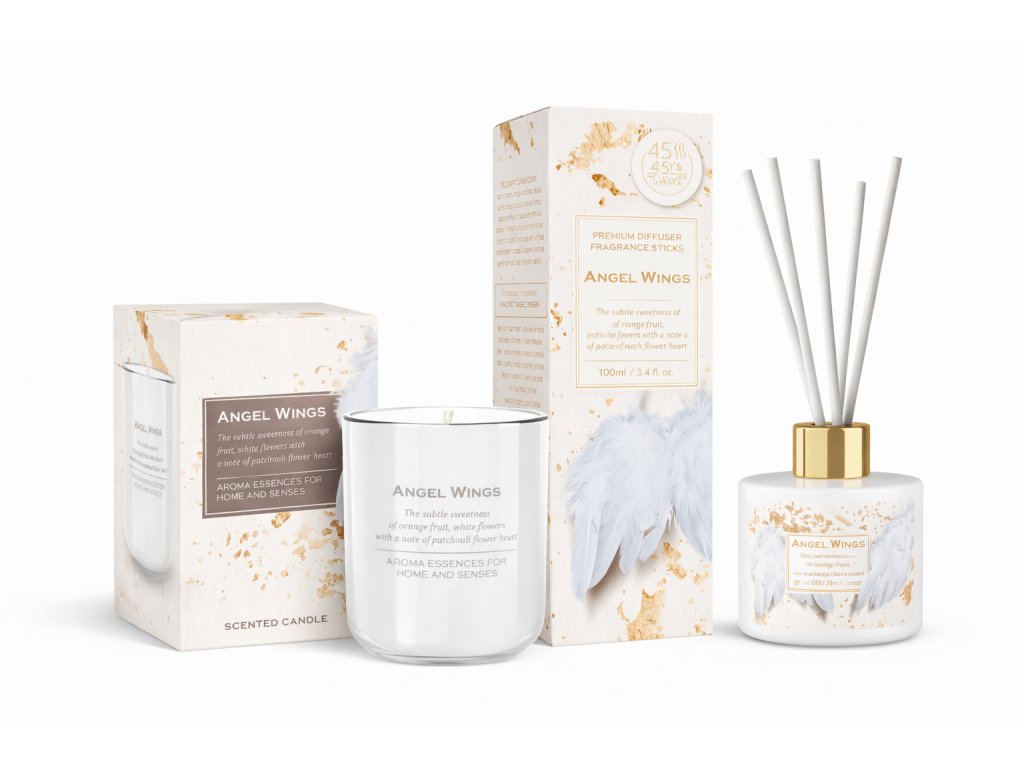Nechte se unést jemností a lehkostí vůně, která působí jako pohlazení pro duši. Set ANGEL WINGS přináší harmonickou, čistou a elegantní atmosféru, která zútulní každý interiér a navodí pocit klidu, bezpečí a rovnováhy.