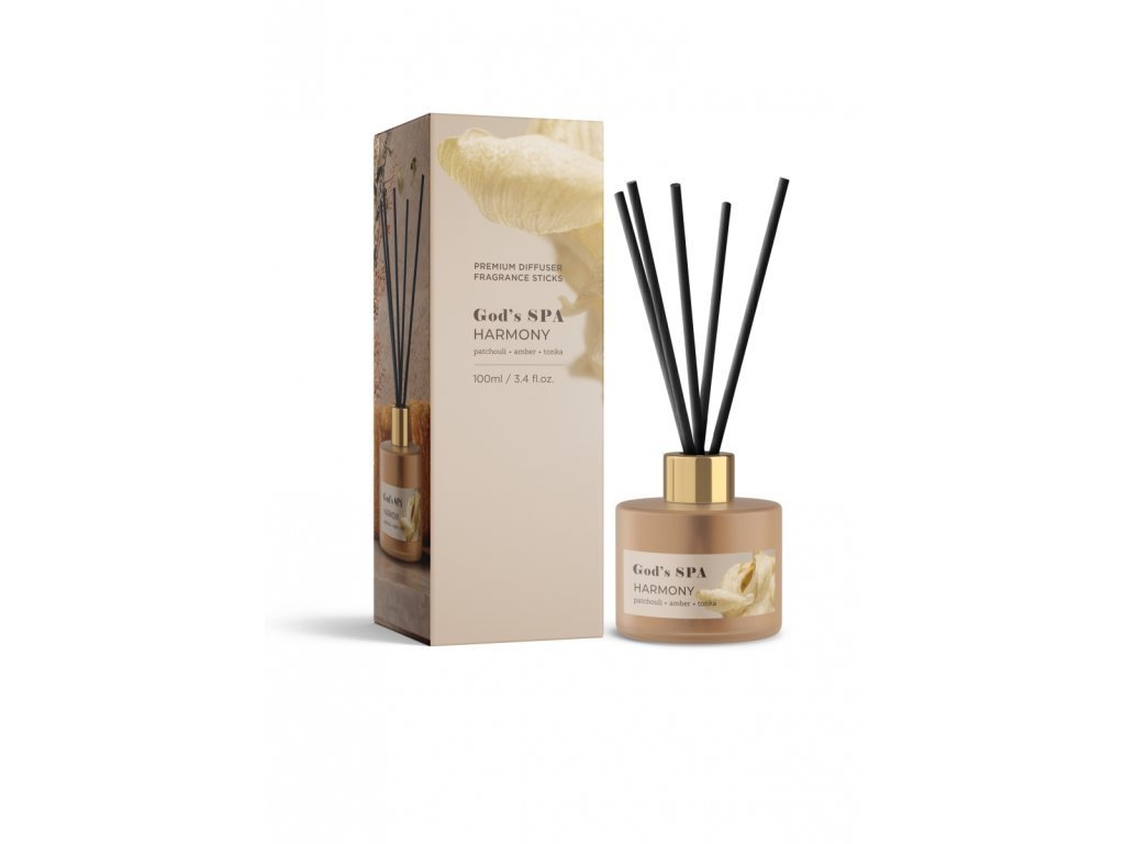 Sójový vosk, drevený knôt s jemným praskaním a rovnomerným horením - 1× Vonný difuzér GOD´S SPA HARMONY 100 ml