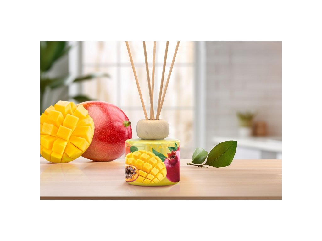 Vonný difuzér Mango & Fruits rozvonia váš domov šťavnatou kombináciou zrelého manga a sladkého tropického ovocia, ktorá navodzuje pocit leta, pohody a dobrej nálady.